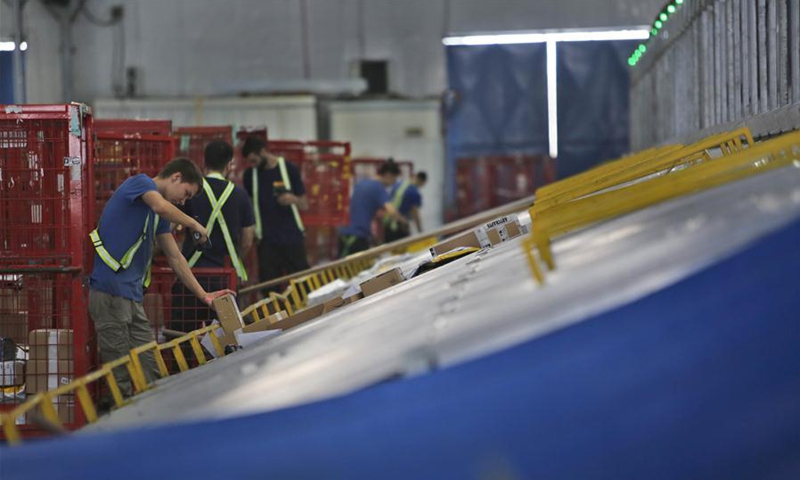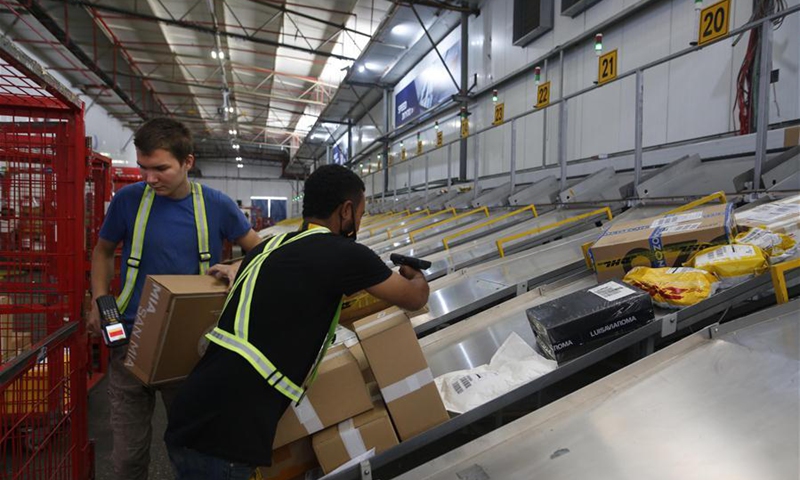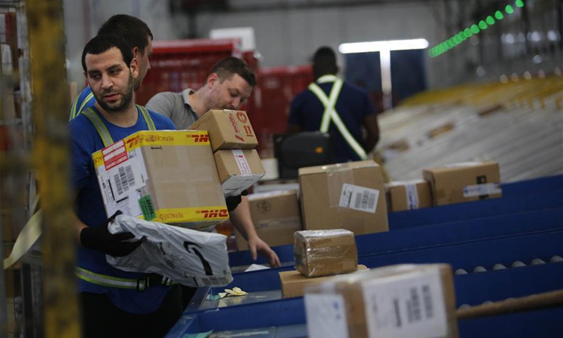 Israeli workers work at the newly built and first automated sorting center in Ben Gurion International Airport near central Israeli city of Tel Aviv on Aug. 18, 2020. The sorting center would largely shorten the delivery time of shipments. (Photo by Gil Cohen Magen/Xinhua)
