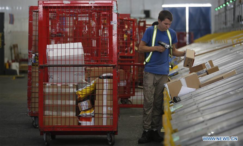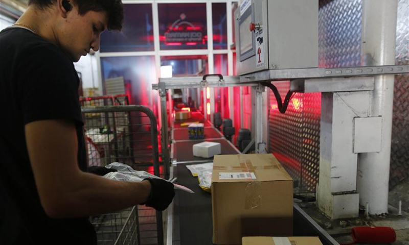 An Israeli worker works at the newly built and first automated sorting center in Ben Gurion International Airport near central Israeli city of Tel Aviv on Aug. 18, 2020. The sorting center would largely shorten the delivery time of shipments. (Photo by Gil Cohen Magen/Xinhua)