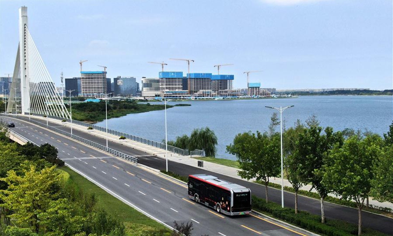 Aerial photo taken on Aug. 18, 2020 shows a self-driving bus of autopilot bus line 1 running on a test road in Zhengzhou, central China's Henan Province. Combining technologies like 5G network service and artificial intelligence with smart supervision and control system, test runs of autopilot bus were held in Zhengzhou in recent days. (Xinhua/Li An)