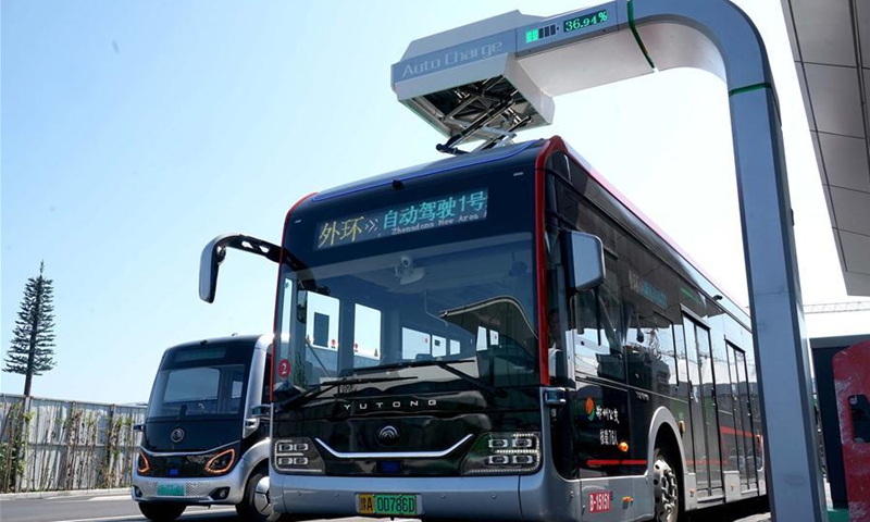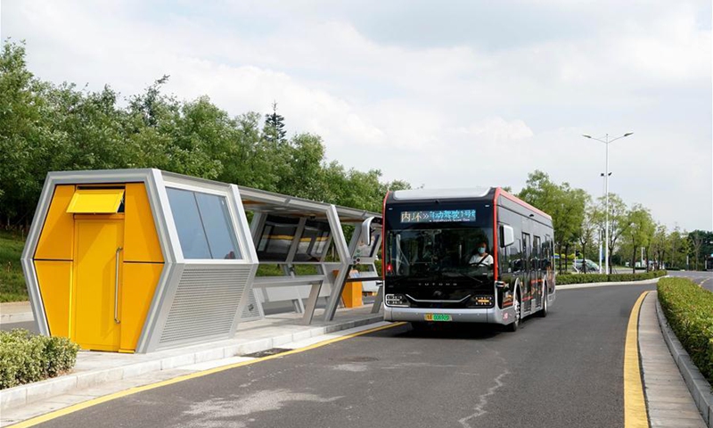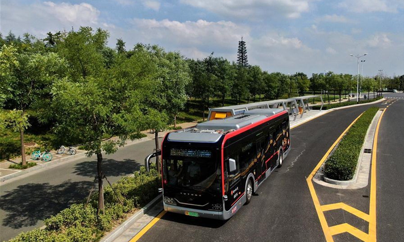 A self-driving bus of autopilot bus line 1 runs in Zhengzhou, central China's Henan Province, Aug. 18, 2020. Combining technologies like 5G network service and artificial intelligence with smart supervision and control system, test runs of autopilot bus were held in Zhengzhou in recent days. (Xinhua/Li An)