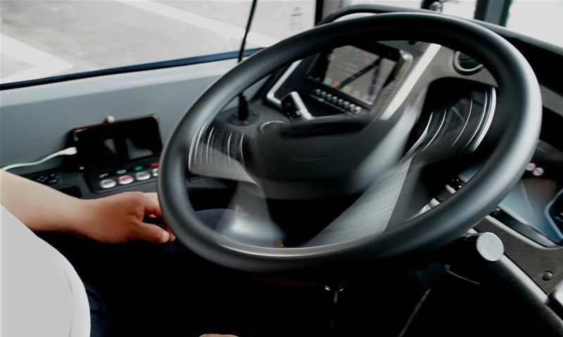 Photo taken on Aug. 18, 2020 shows the rotating steering wheel of a self-driving bus of autopilot bus line 1 in Zhengzhou, central China's Henan Province. Combining technologies like 5G network service and artificial intelligence with smart supervision and control system, test runs of autopilot bus were held in Zhengzhou in recent days. (Xinhua/Li An)