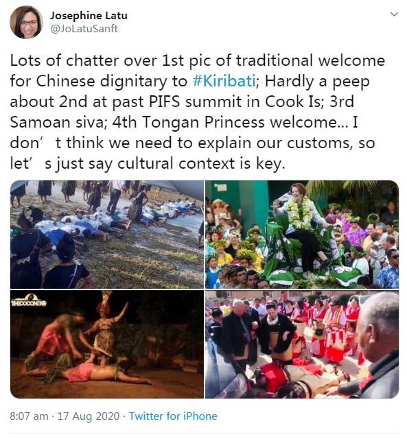 The misrepresentation of a photo of the Chinese ambassador to Kiribati walking across the backs of locals in a traditional welcoming ceremony was refuted by local officials, and criticized by experts as a move intended to damage China's image in the island.