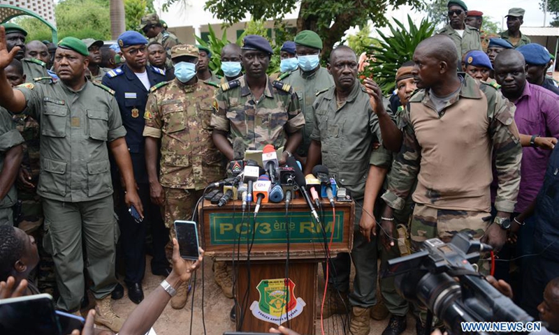 The spokesperson of the mutineers, Col. Maj. Ismael Wague (C) speaks during a press conference in Kati, near Bamako, Mali, on Aug. 19, 2020. Mali's mutinous soldiers on Wednesday announced the creation of the National Committee for the Salvation of the People (CNSP) to lead a political transition toward general elections following the resignation of President Ibrahim Boubacar Keita and the dissolution of the National Assembly and the government. (Photo by Habib Kouyate/Xinhua)