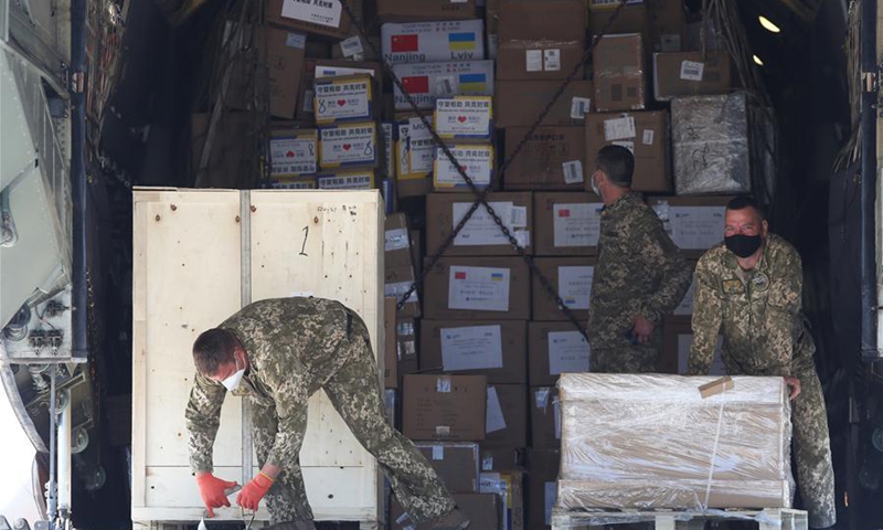 Personnel unload humanitarian aid from a plane at the Boryspil International Airport in Kiev, Ukraine, June 24, 2020. Photo: Xinhua