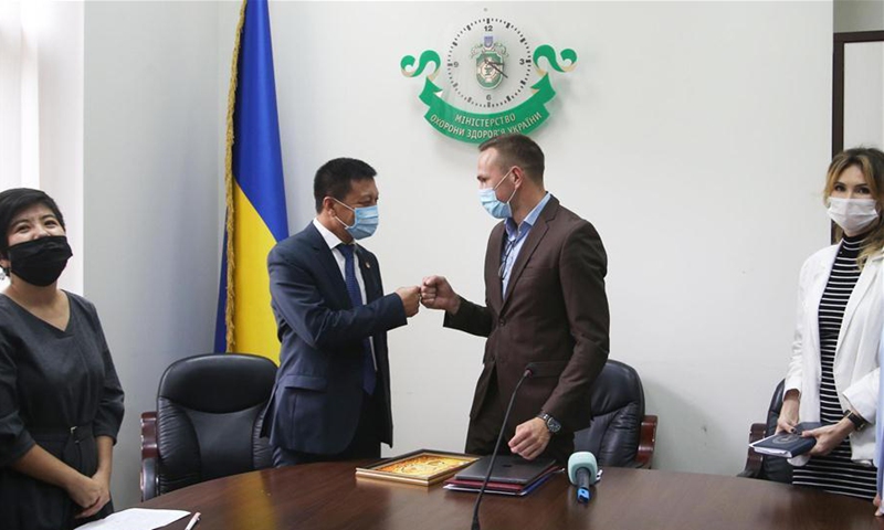 Ukraine's Deputy Minister of Health Igor Ivashchenko (2nd R) fist bumps Li Xuegang, head of non-profit organization Diaspora Chinese In Ukraine, during a donation ceremony at the Ministry of Health in Kiev, Ukraine, July 13, 2020. The Ukrainian Health Ministry on Monday received a batch of medical supplies donated by the Chinese community in Ukraine to fight the COVID-19. The cargo will be distributed among healthcare institutions, higher education institutions and regional state administrations. (Photo by Sergey Starostenko/Xinhua)
