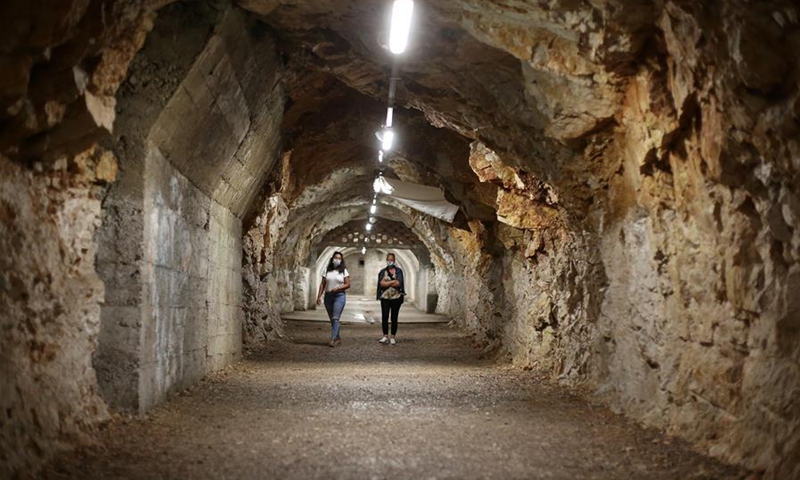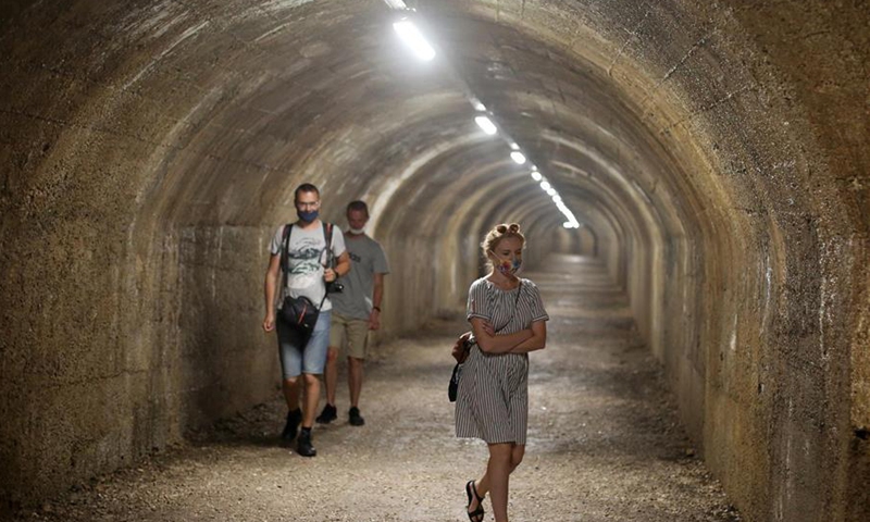 Tourists visit the Rijeka Tunnel (also known as TunelRi) in Rijeka, Croatia, Aug. 19, 2020. The tunnel was dug to protect civilians from bombings during World War II and is now a tourist attraction. (Goran Kovacic/Pixsell via Xinhua)
