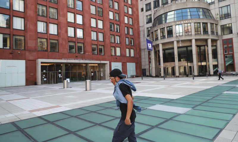 A man walks past buildings of New York University in New York, the United States, July 14, 2020. (Xinhua/Wang Ying)