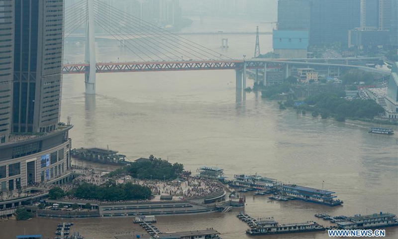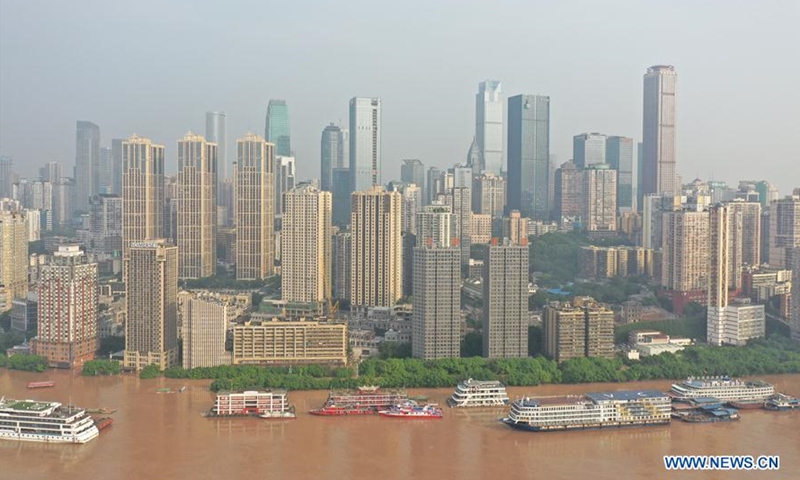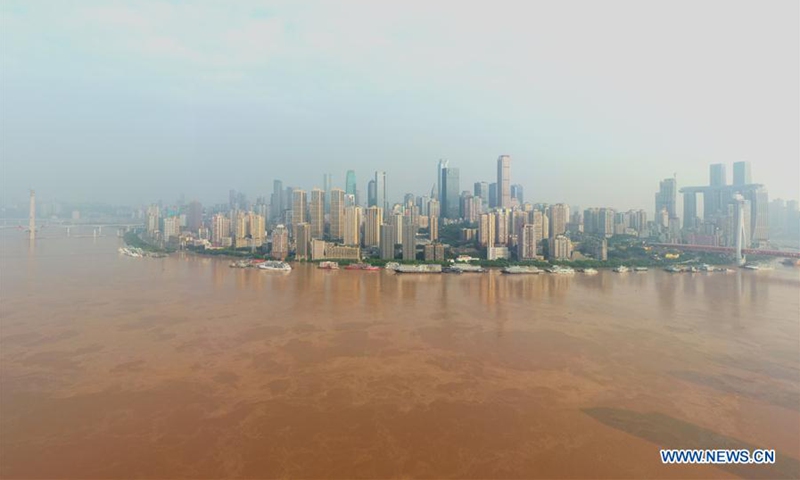 Aerial photo taken on Aug. 20, 2020 shows floodwater passing through the downtown area of southwest China's Chongqing Municipality. Yangtze River's water level in Chongqing Municipality exceeded historical high earlier Thursday morning, posing unprecedented threat to the metropolis in southwest China. At around 8 a.m. Thursday, the water level at the Cuntan hydrologic station in Chongqing reached 191.55 meters, 0.14 meters higher than the record in 1981, and was rising. (Xinhua/Liu Chan)