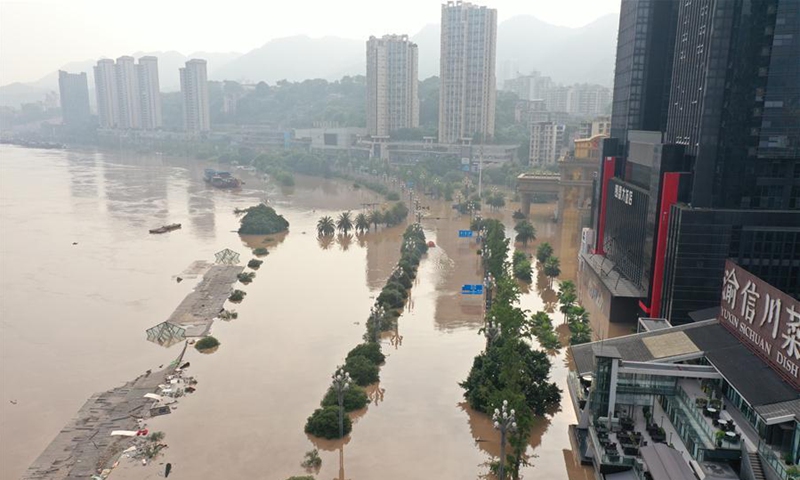 Aerial photo shows a flooded section of Nanbin Road in Nan'an District of southwest China's Chongqing Municipality, Aug. 20, 2020. Yangtze River's water level in Chongqing Municipality exceeded historical high earlier Thursday morning, posing unprecedented threat to the metropolis in southwest China. At around 8 a.m. Thursday, the water level at the Cuntan hydrologic station in Chongqing reached 191.55 meters, 0.14 meters higher than the record in 1981, and was rising. (Xinhua/Liu Chan)