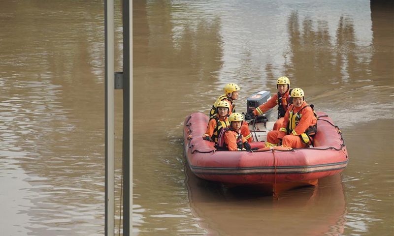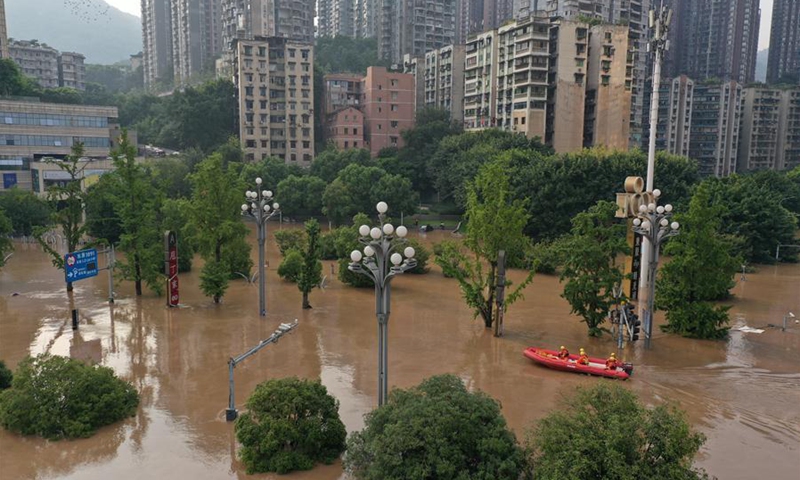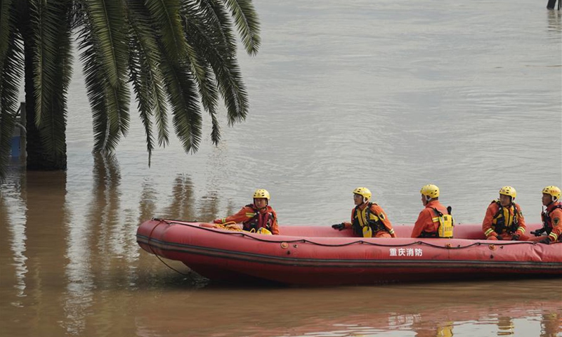 Rescuers patrol a flooded section of Nanbin Road in Nan'an District of southwest China's Chongqing Municipality, Aug. 20, 2020. Yangtze River's water level in Chongqing Municipality exceeded historical high earlier Thursday morning, posing unprecedented threat to the metropolis in southwest China. At around 8 a.m. Thursday, the water level at the Cuntan hydrologic station in Chongqing reached 191.55 meters, 0.14 meters higher than the record in 1981, and was rising. (Xinhua/Liu Chan)