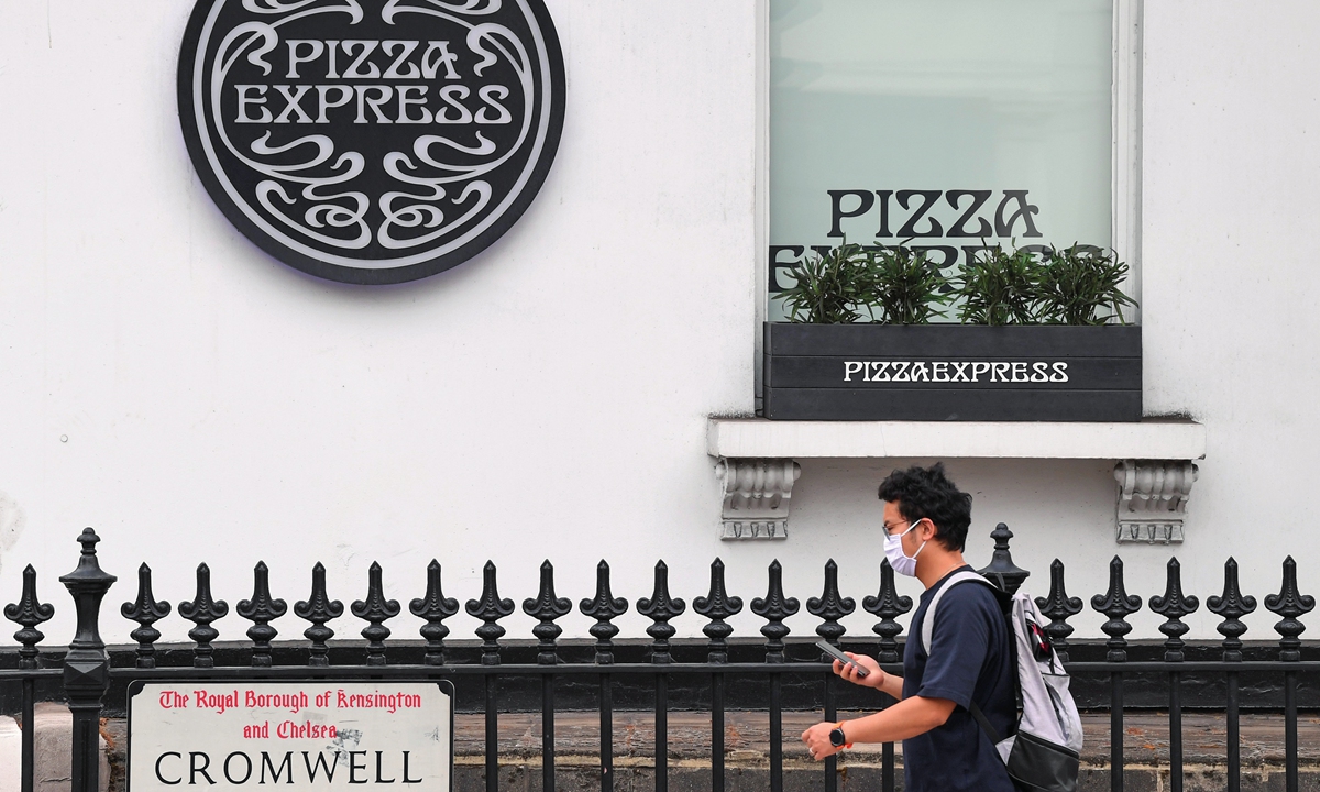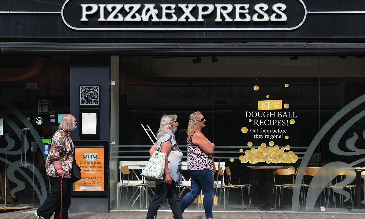 Pedestrians wearing face masks due to the COVID-19 pandemic walk past a Pizza Express restaurant in west London on August 4. Photo: AFP