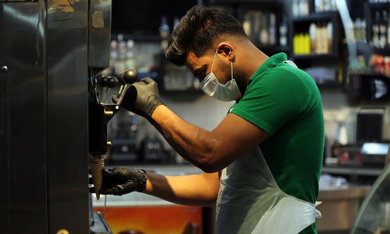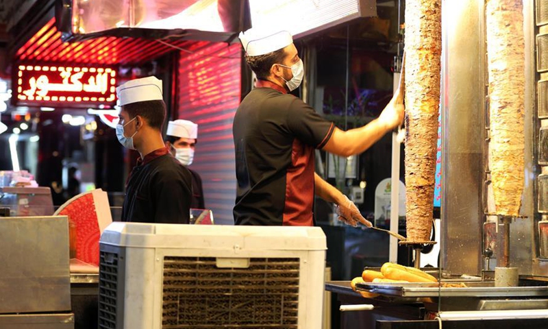 Workers wearing face masks work at a restaurant in Baghdad, Iraq on Aug. 19, 2020. Night life has been resuming in Baghdad since Aug. 16, when the Iraqi Higher Committee for Health and National Safety cancelled the weekly three-day full curfew to replace them with partial curfew every week and reduced the partial curfew hours to be from 10:00 p.m. to 5:00 a.m. (Xinhua)