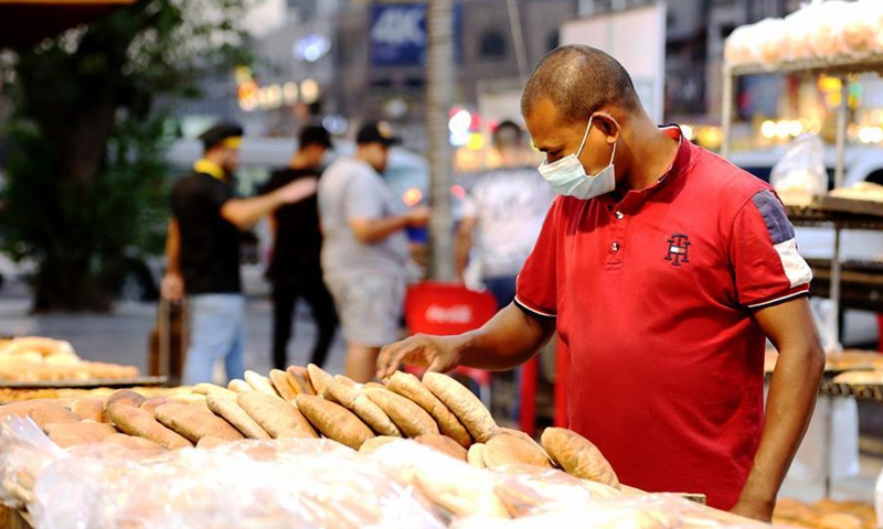 A man wearing a face mask buys bread in Baghdad, Iraq on Aug. 19, 2020. Night life has been resuming in Baghdad since Aug. 16, when the Iraqi Higher Committee for Health and National Safety cancelled the weekly three-day full curfew to replace them with partial curfew every week and reduced the partial curfew hours to be from 10:00 p.m. to 5:00 a.m. (Xinhua)