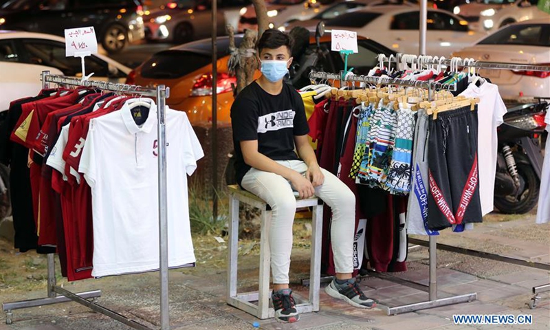 A vendor wearing a face mask is seen in Baghdad, Iraq on Aug. 19, 2020. Night life has been resuming in Baghdad since Aug. 16, when the Iraqi Higher Committee for Health and National Safety cancelled the weekly three-day full curfew to replace them with partial curfew every week and reduced the partial curfew hours to be from 10:00 p.m. to 5:00 a.m. (Xinhua)