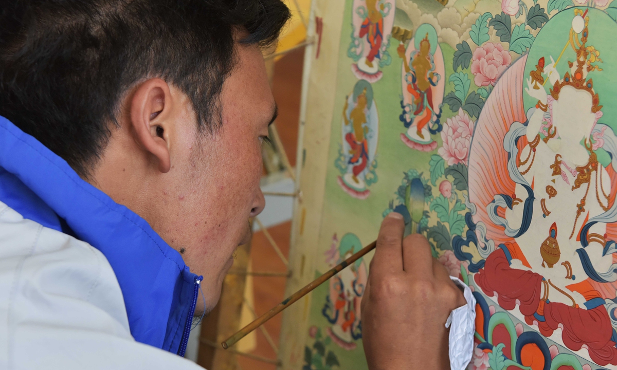 A young apprentice learns to paint Thangka, a traditional Tibetan Buddhist art form, at an intangible cultural heritage workshop in Qamdo. Photo: cnsphoto