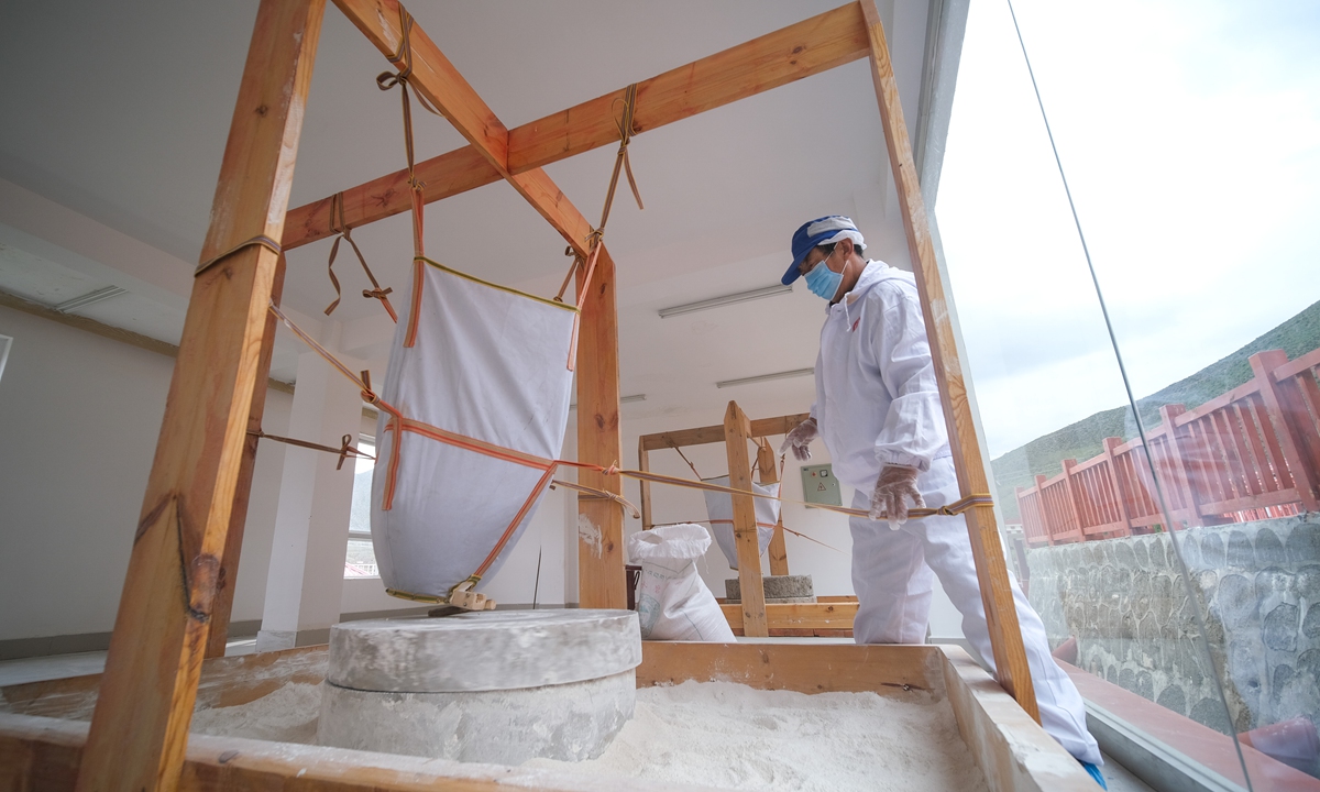 A worker grinds zanba at a large highland barley processing factory in Qamdo. Photo: cnsphoto