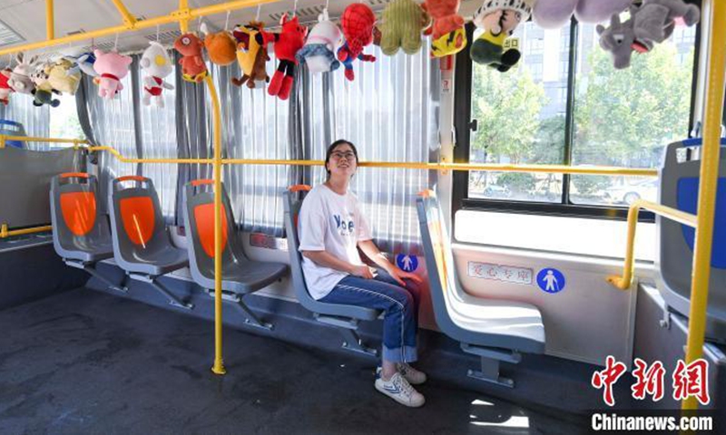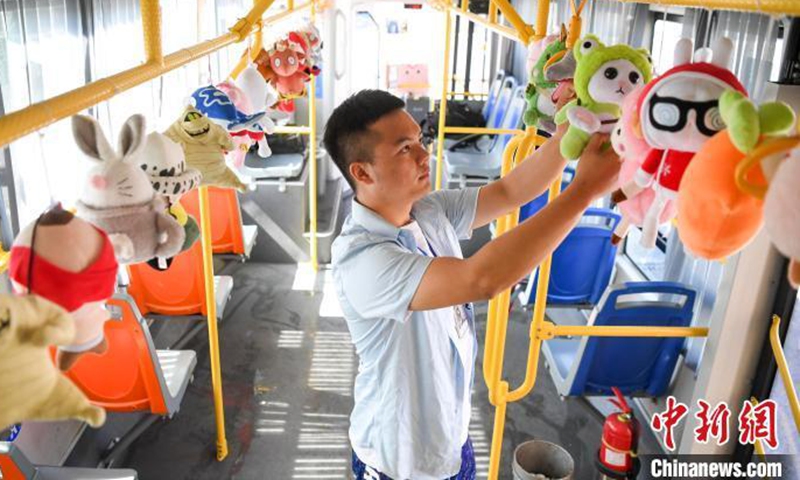 Bus driver Tang Pengcheng decorates the bus with fluffy toys in Changsha City, Hunan Province, August 20, 2020.Photo:China News Service