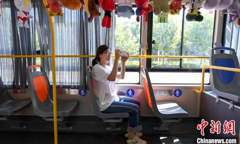A passenger takes photo of fluffy toys in a bus in Changsha City, Hunan Province, August 20, 2020.Photo:China News Service