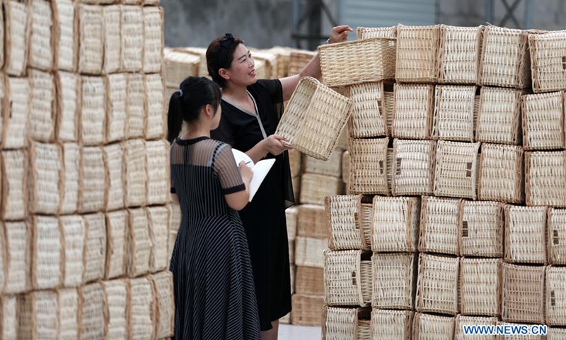 Villagers make willow knitting products in Miaoshan Town of Tancheng County, east China's Shandong Province, Aug. 20, 2020. Tancheng County has a long tradition of making willow knitting products and encourages craftspeople to pass down old techniques as well as innovate some new ones. By virtue of e-business platform, the willow knitting products are welcomed by domestic and foreign market.Photo:Xinhua