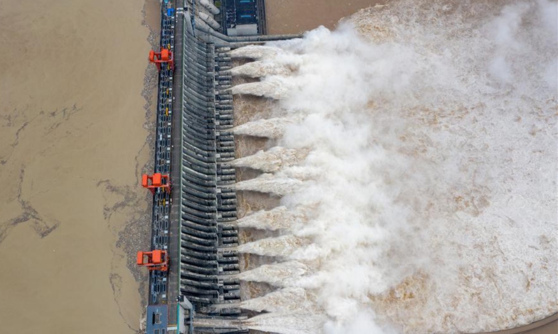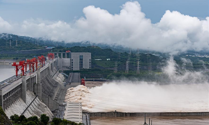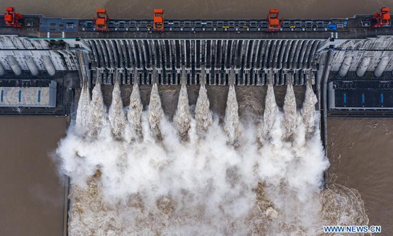 Aerial photo taken on Aug. 20, 2020 shows floodwater gushing out from the Three Gorges Dam in central China's Hubei Province. The Three Gorges Reservoir is undergoing the test of a record high inbound water flow on Wednesday since the reservoir was constructed in 2003. The inbound flow reached 75,000 cubic meters per second around 8 a.m. as the peak floodwater of Yangtze River's fifth flood of the year arrived at the dam. Photo:Xinhua