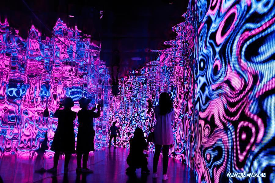 A girl visits the 2020 Beijing International Light Festival at Yuyuantan Park in Beijing, capital of China, Aug. 20, 2020. The 2020 Beijing International Light Festival kicked off at Yuyuantan Park in Beijing on Thursday. The exhibition mixed light, laser light, images, music and performances with the natural landscape of the park, providing an immersive experience for visitors. (Xinhua/Zhang Chen)
