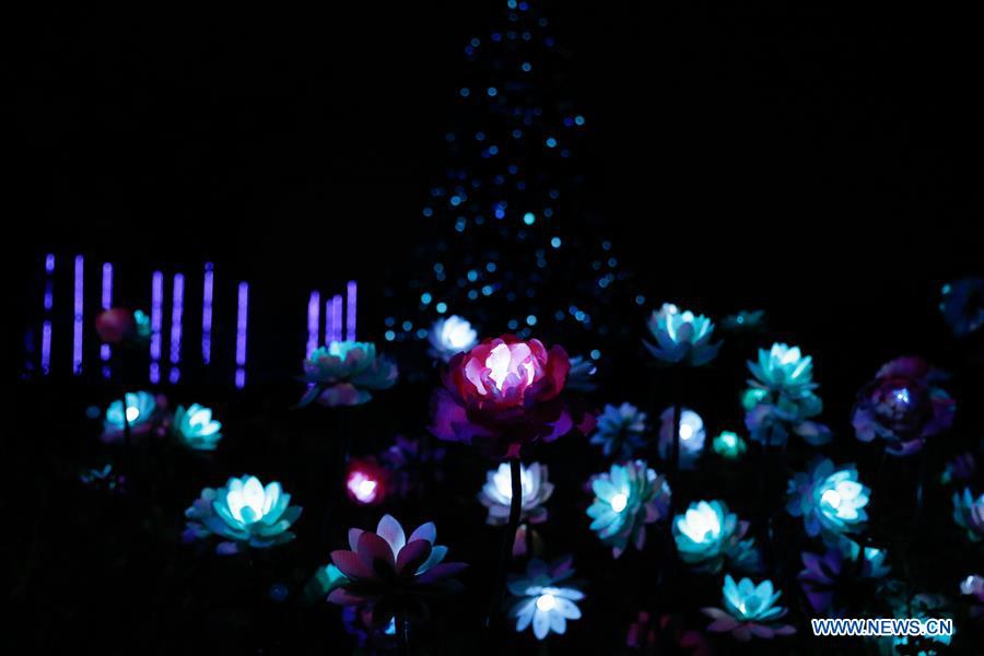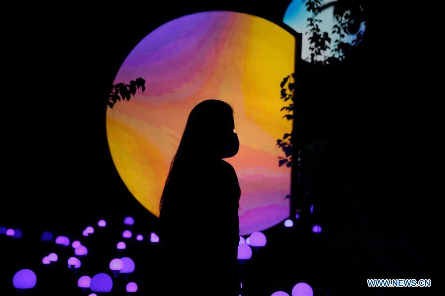 A woman visits the 2020 Beijing International Light Festival at Yuyuantan Park in Beijing, capital of China, Aug. 20, 2020. The 2020 Beijing International Light Festival kicked off at Yuyuantan Park in Beijing on Thursday. The exhibition mixed light, laser light, images, music and performances with the natural landscape of the park, providing an immersive experience for visitors. (Xinhua/Zhang Chen)