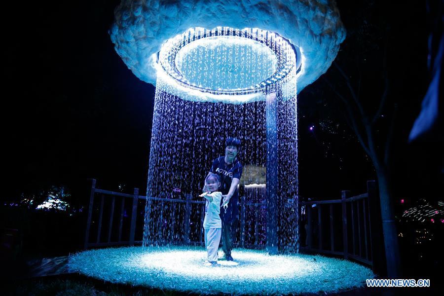 A woman and her child visit the 2020 Beijing International Light Festival at Yuyuantan Park in Beijing, capital of China, Aug. 20, 2020. The 2020 Beijing International Light Festival kicked off at Yuyuantan Park in Beijing on Thursday. The exhibition mixed light, laser light, images, music and performances with the natural landscape of the park, providing an immersive experience for visitors. (Xinhua/Zhang Chen)