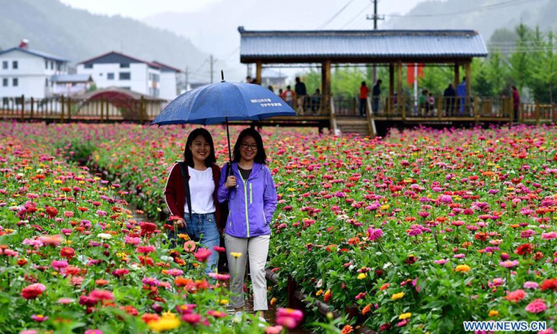 Tourist visit sea of zinnia flowers in Dahong Village of Luanchuan County in Luoyang, central China's Henan Province, Aug. 21, 2020. Over 200 mu (about 13 hectares) of zinnia flowers have been in full bloom in the village recently.Photo:Xinhua