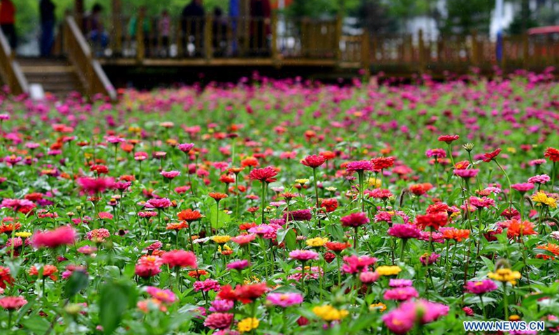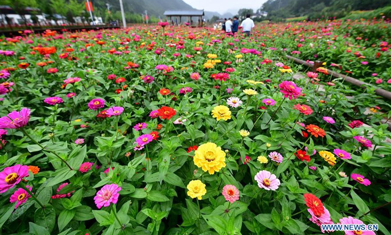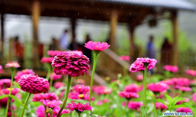 Photo taken on Aug. 21, 2020 shows zinnia flowers in Dahong Village of Luanchuan County in Luoyang, central China's Henan Province. Over 200 mu (about 13 hectares) of zinnia flowers have been in full bloom in the village recently.Photo:Xinhua
