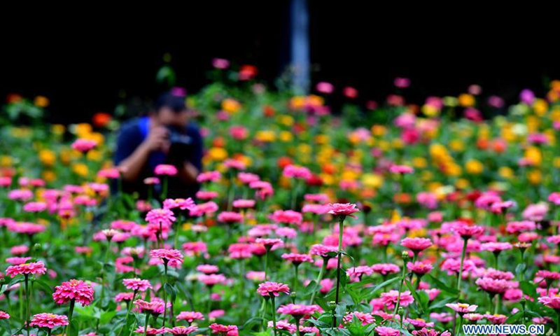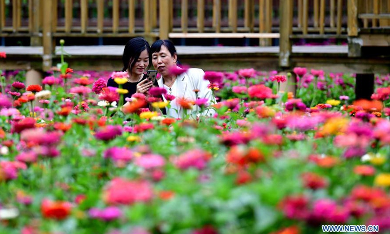 Tourists take photos of zinnia flowers in Dahong Village of Luanchuan County in Luoyang, central China's Henan Province, Aug. 21, 2020. Over 200 mu (about 13 hectares) of zinnia flowers have been in full bloom in the village recently.Photo:Xinhua