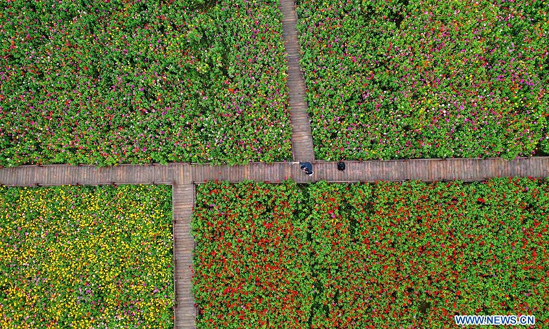 Aerial photo taken on Aug. 21, 2020 shows tourists walking amid zinnia flowers in Dahong Village of Luanchuan County in Luoyang, central China's Henan Province. Over 200 mu (about 13 hectares) of zinnia flowers have been in full bloom in the village recently. Photo:Xinhua