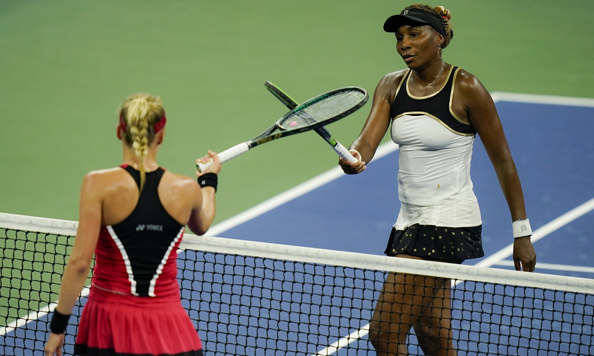 Venus Williams (right) taps rackets with Dayana Yastremska after their match at the Western & Southern Open on Saturday in New York City. Photo: IC