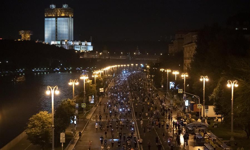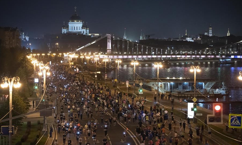 Runners compete during a 10km Night Run event in Moscow, Russia, Aug. 22, 2020. (Photo by Alexander Zemlianichenko Jr/Xinhua)