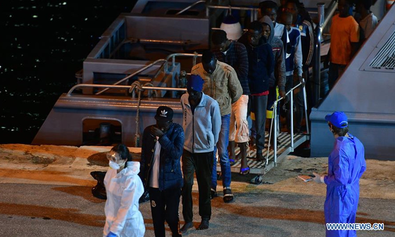 Migrants disembark at Boiler Wharf in Senglea, Malta, on July 8, 2020. A group of 52 migrants who were rescued from the high seas on Saturday were allowed to disembark in Malta, local media reported on Wednesday. (Photo by Jonathan Borg/Xinhua)
