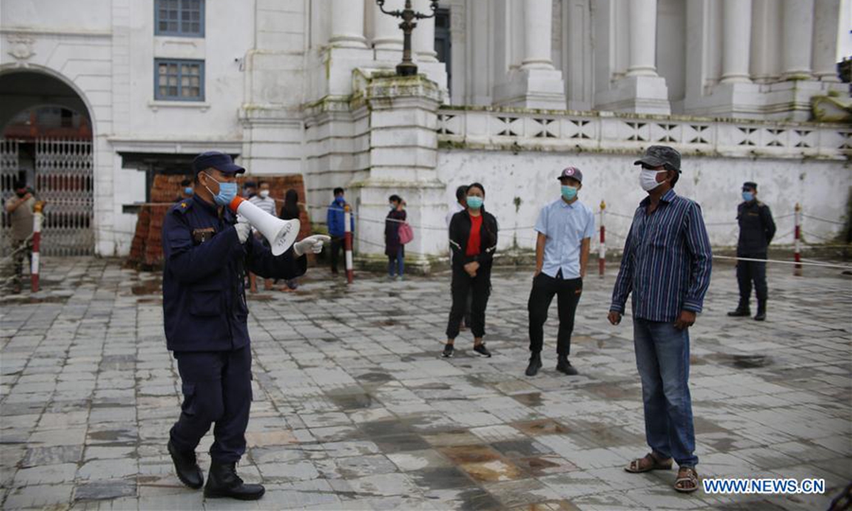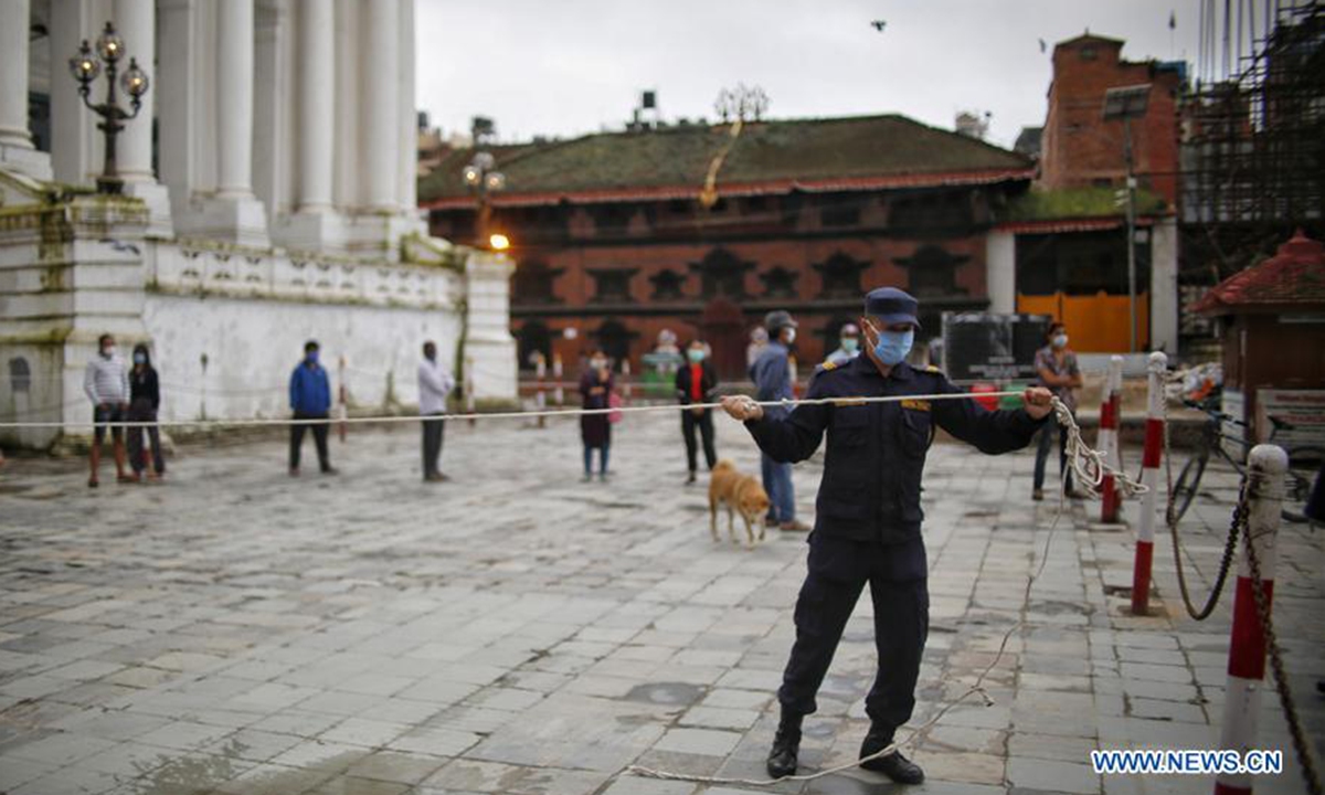 A Nepalese policeman ties a rope for detaining people who disobey the prohibitory order implemented to control the COVID-19 pandemic at the premises of Basantapur Durbar Square in Kathmandu, Nepal on Aug. 24, 2020. (Photo by Sulav Shrestha/Xinhua)