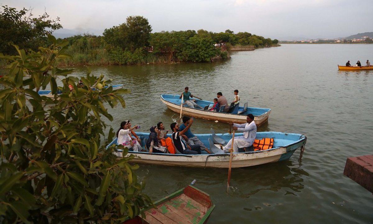 Tourists enjoy boat ride at the Lake View Park in Islamabad, capital of Pakistan on Aug. 23, 2020. (Xinhua/Ahmad Kamal)