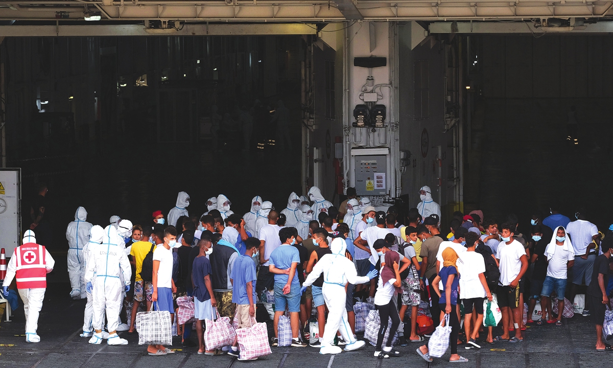Migrants board the MS GNV Azzurra quarantine ship which has been sent to the Pelagie Island of Lampedusa, Italy on August 4, amid the COVID-19 pandemic. Photo: AFP