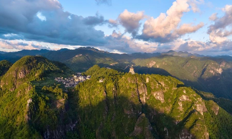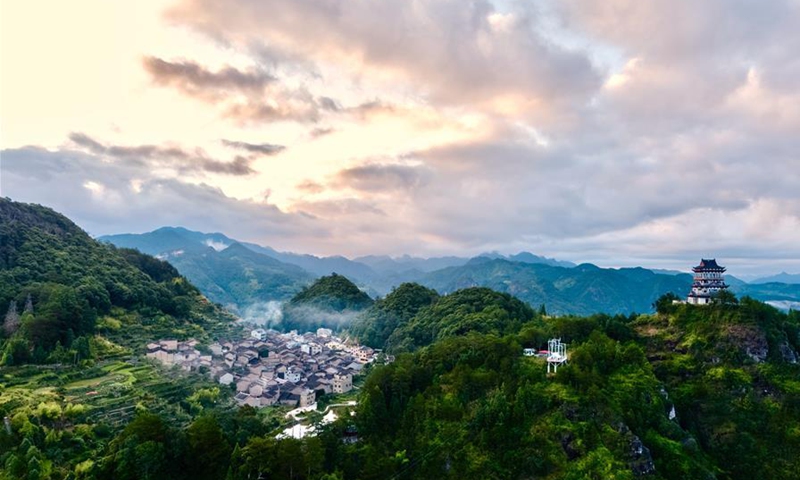 Aerial photo taken on Aug. 2, 2020 shows the sunset scenery of Chenqiao Village, Zhouning County, southeast China's Fujian Province