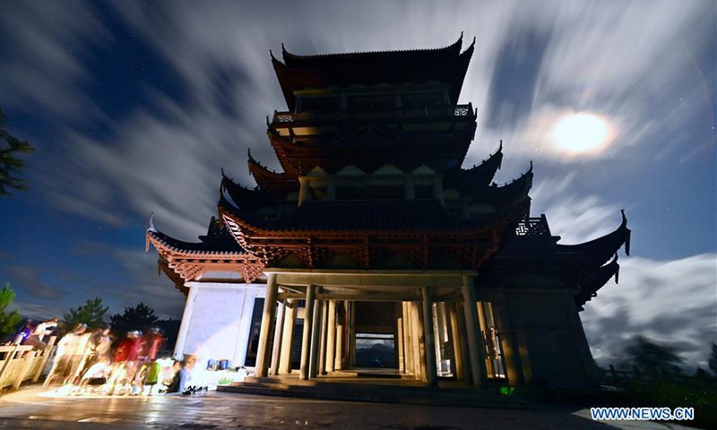 Tourists visit the Juxian Pavilion at night in Chenqiao Village, Zhouning County, southeast China's Fujian Province, Aug. 1, 2020. (Xinhua/Jiang Kehong)