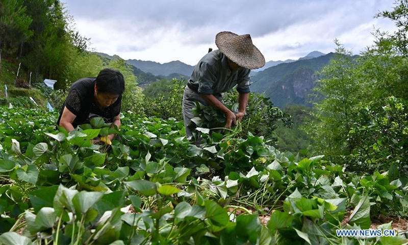 Villagers work in a sweet potato field in Chenqiao Village, Zhouning County, southeast China's Fujian Province, Aug. 3, 2020. (Xinhua/Jiang Kehong)