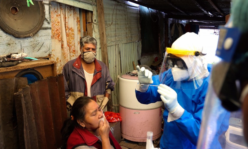 A medical worker takes a swab sample from a woman for COVID-19 test in Mexico City, Mexico, Aug. 13, 2020.(Photo by Israel Rosas/Xinhua)