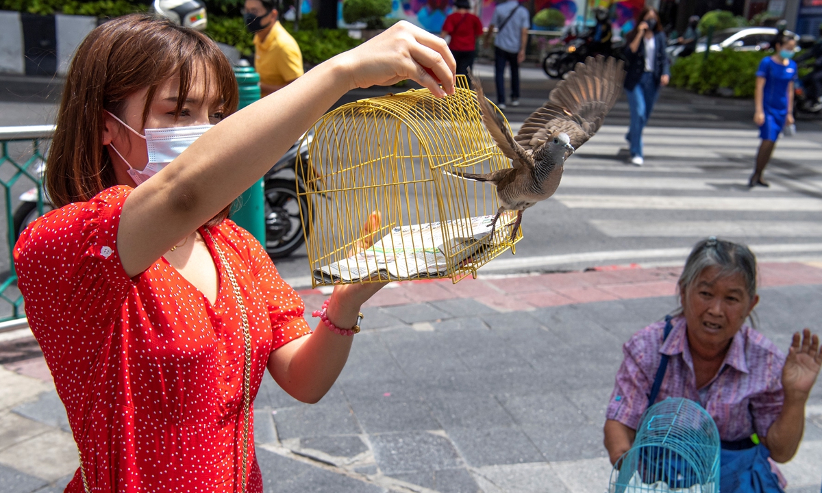 A woman releases an oriental turtle dove from its cage as a Thai Buddhist religious belief of attaining good karma outside a shrine in downtown Bangkok, Thailand on Thursday. Photo: AFP