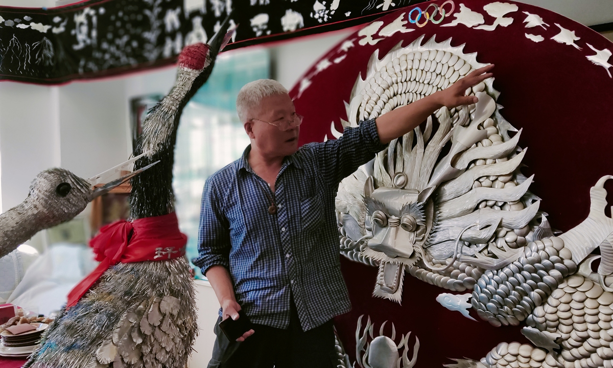 An artist of the Chinese Intangible Cultural Heritage Project in Qiqihar, Northeast China's Heilongjiang Province, shows off on Wednesday a handcrafted masterpiece titled "Flying Dragon and Dancing Crane" made from 1,000 discarded cans, which took him 10 months to complete. Photo: IC