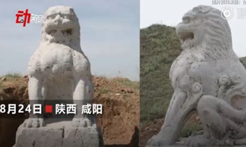 Police in Xianyang, Northwest China's Shaanxi Province, offers a reward of one million yuan ($145,000) for a pair of stone lions dating back to the Tang Dynasty (618-907) which have been missing for ten years. Photo: Screenshot of a video posted by The Beijing News