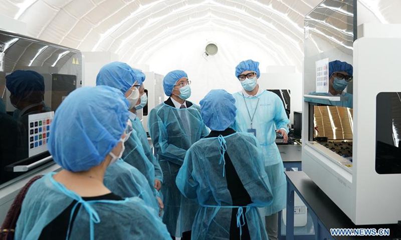 The Permanent Secretary for Food and Health (Health) of the HKSAR government Thomas Chan, who led the work group on testing of the HKSAR government, along with leader of the nucleic acid testing team from the Chinese mainland (Guangdong province), Yu Dewen, as well as members of the HKSAR government's work group and mainland's support team on Wednesday inspected the preparation of the temporary air-inflated laboratory and testing procedures.