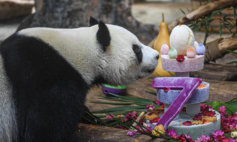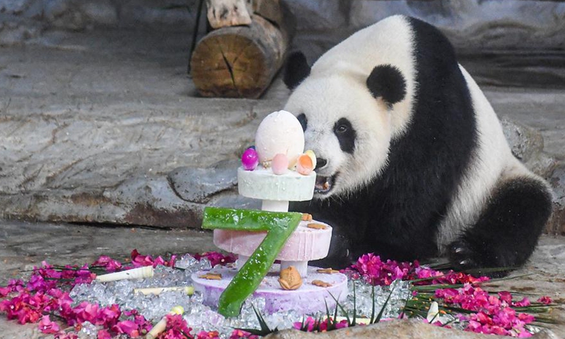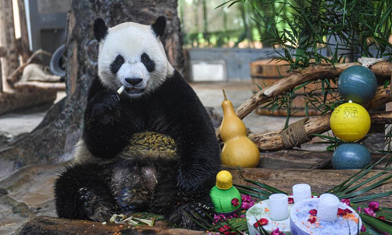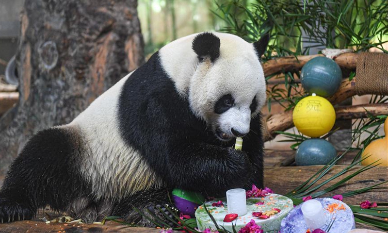 Giant panda Shunshun enjoys a birthday cake at Hainan Tropical Wildlife Park and Botanical Garden in Haikou, south China's Hainan Province, Aug. 27, 2020. The park held celebrations for the seventh birthday of two giant pandas on Thursday. Photo:Xinhua