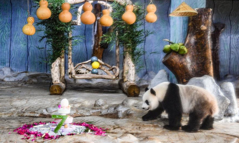 Giant panda Gonggong prepares to enjoy food at Hainan Tropical Wildlife Park and Botanical Garden in Haikou, south China's Hainan Province, Aug. 27, 2020. The park held celebrations for the seventh birthday of two giant pandas on Thursday. Photo:Xinhua