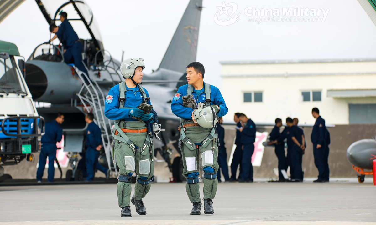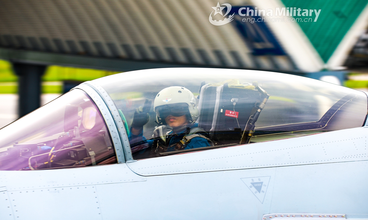A pilot assigned to an aviation brigade of the air force under the PLA Southern Theater Command gestures at the ground crews before takeoff during a flight training exercise under unfavorable meteorology conditions in mid August, 2020.Photo:China Military