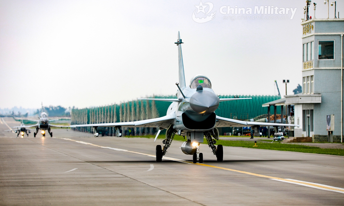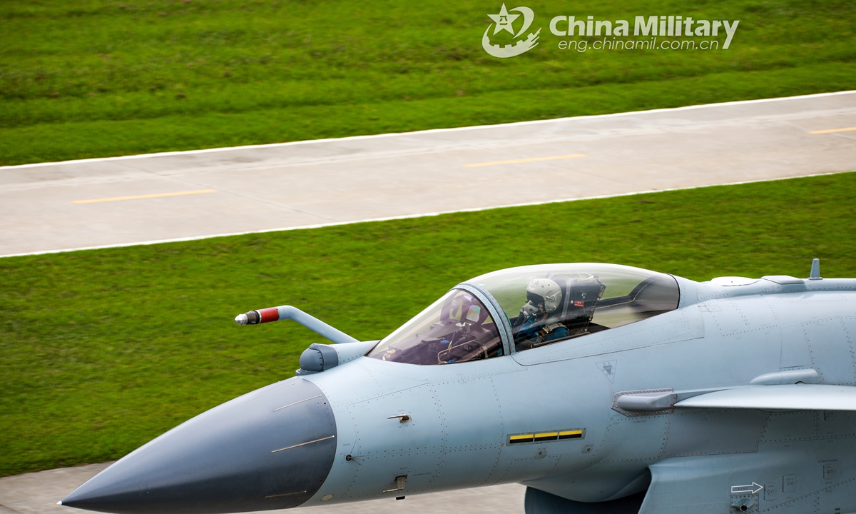 A J-10 fighter jet attached to an aviation brigade of the air force under the PLA Southern Theater Command taxies on the runway before takeoff for a flight training exercise under unfavorable meteorology conditions in mid August, 2020.Photo:China Military