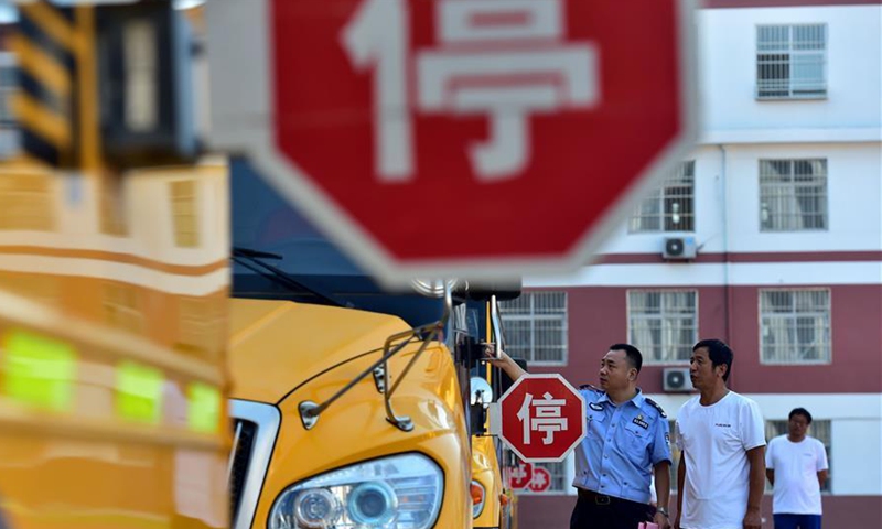 A policeman checks the signs on the exterior of school buses of Tianhe primary school in Gaocheng District of Shijiazhuang, north China's Hebei Province, Aug. 27, 2020. Gaocheng District of Shijiazhuang organized police officers to carry out safety and performance checks of all school buses within the district, as a way to prepare for the new term and ensure the transportation safety of students. (Xinhua/Luo Xuefeng)